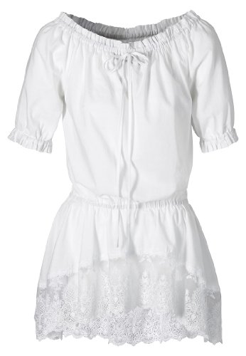 Blouse tunique à porter sur les épaules. Encolure, bas des manches et taille élastiqués. Large liseré de dentelle en bas de la jupe. Légèrement asymétrique avec un pan plus long à l'arrière. Le bas de la blouse présente une forme légèrement arrondie. Longueur : env. 80cm.